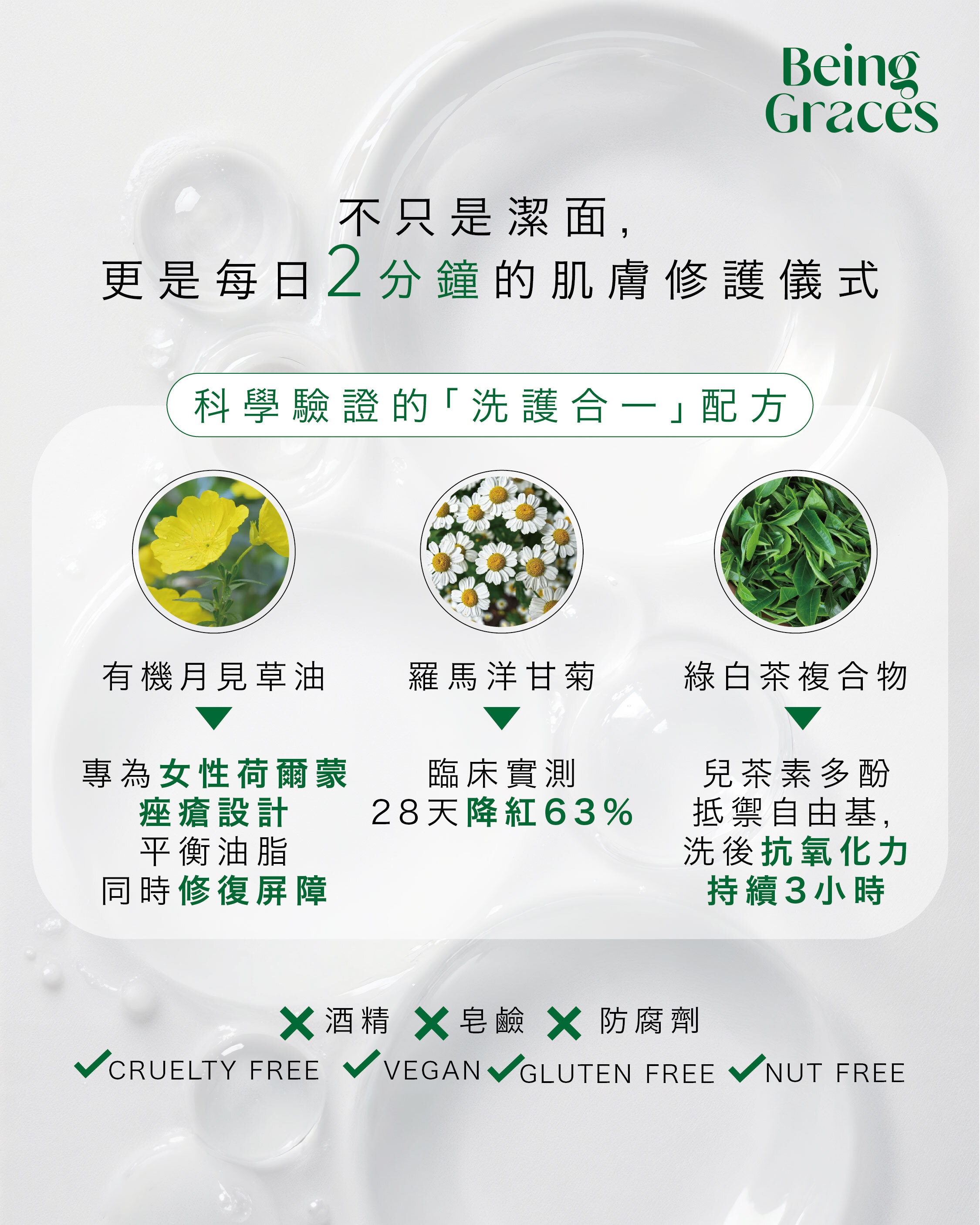 ▸ 問題:經期前爆痘、泛紅,一般潔面產品越洗越乾
